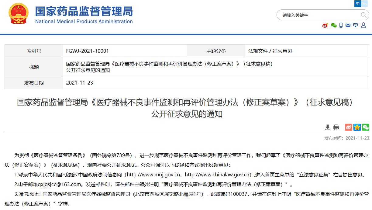 國家藥品監(jiān)督管理局《醫(yī)療器械不良事件監(jiān)測和再評(píng)價(jià)管理辦法(修正案草案)》(征求意見稿)公開征求意見的通知