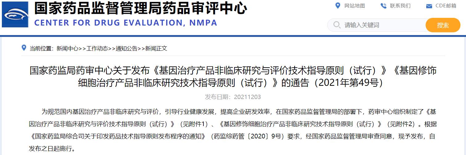 國(guó)家藥監(jiān)局藥審中心關(guān)于發(fā)布《基因治療產(chǎn)品非臨床研究與評(píng)價(jià)技術(shù)指導(dǎo)原則(試行)》《基因修飾細(xì)胞治療產(chǎn)品非臨床研究技術(shù)指導(dǎo)原則(試行)》的通告(2021年第49號(hào))