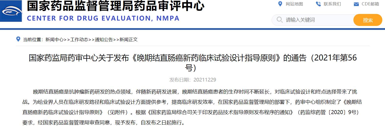 國(guó)家藥監(jiān)局藥審中心關(guān)于發(fā)布《晚期結(jié)直腸癌新藥臨床試驗(yàn)設(shè)計(jì)指導(dǎo)原則》的通告(2021年第56號(hào))