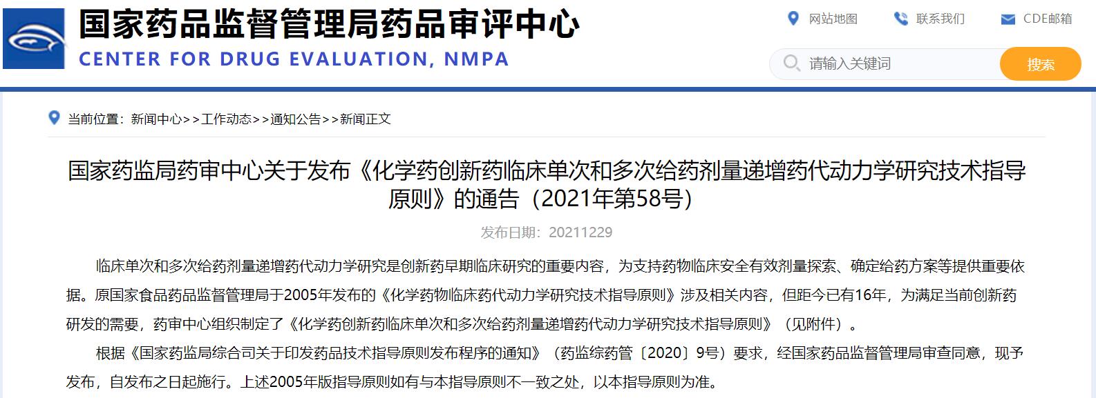 國(guó)家藥監(jiān)局藥審中心關(guān)于發(fā)布《化學(xué)藥創(chuàng)新藥臨床單次和多次給藥劑量遞增藥代動(dòng)力學(xué)研究技術(shù)指導(dǎo)原則》的通告(2021年第58號(hào))