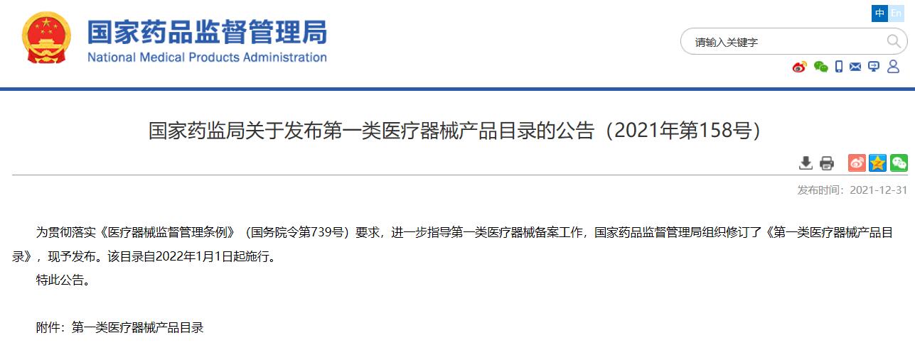 國(guó)家藥監(jiān)局關(guān)于發(fā)布第一類醫(yī)療器械產(chǎn)品目錄的公告(2021年第158號(hào))