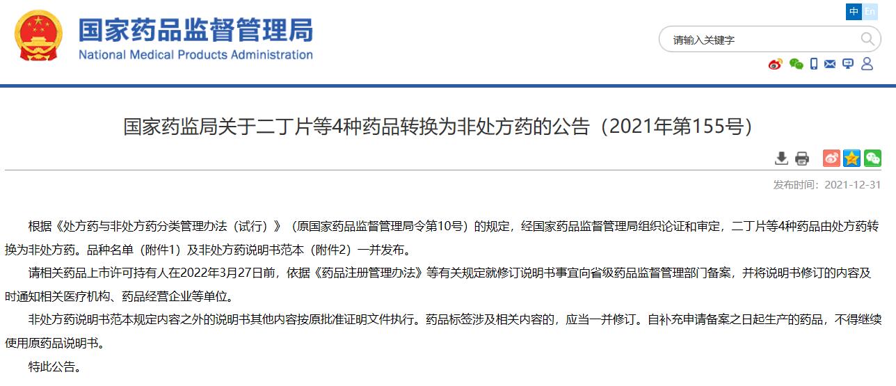 國(guó)家藥監(jiān)局關(guān)于二丁片等4種藥品轉(zhuǎn)換為非處方藥的公告(2021年第155號(hào))