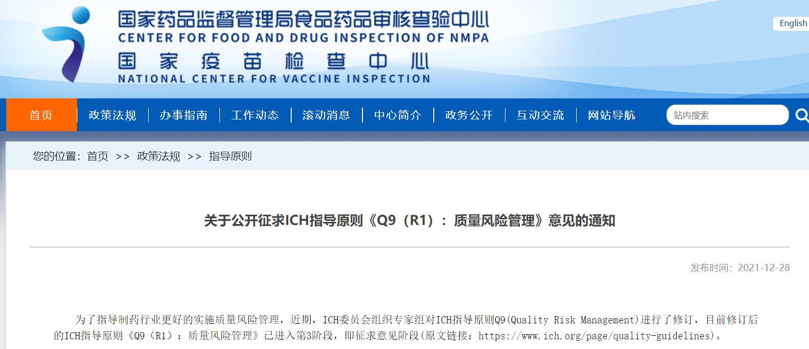 關(guān)于公開征求ICH指導(dǎo)原則《Q9(R1):質(zhì)量風(fēng)險(xiǎn)管理》意見的通知