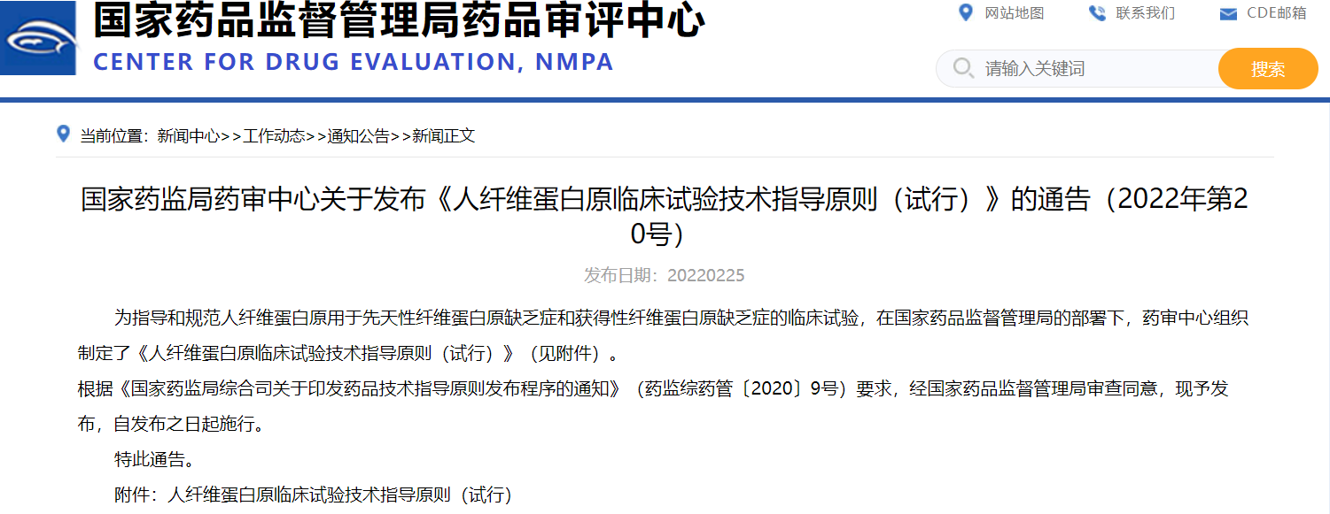 國(guó)家藥監(jiān)局藥審中心關(guān)于發(fā)布《人纖維蛋白原臨床試驗(yàn)技術(shù)指導(dǎo)原則(試行)》的通告(2022年第20號(hào))