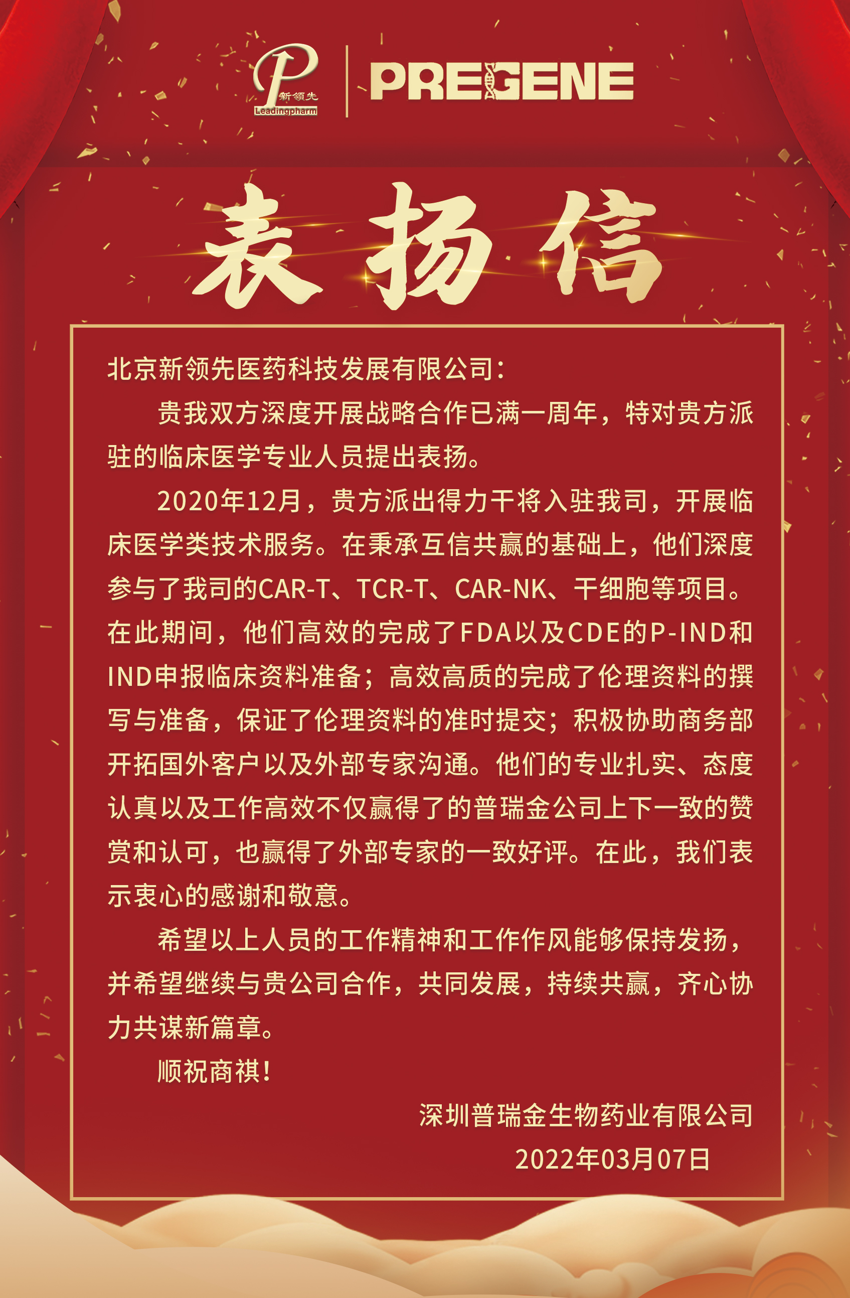 來自深圳普瑞金的合作表揚信