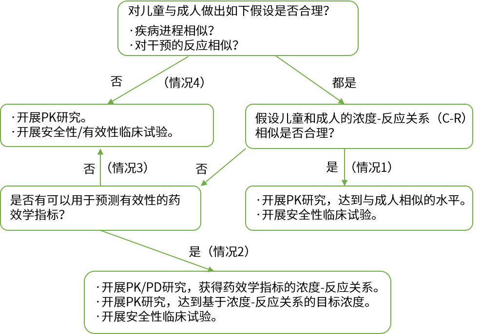 決策:目標(biāo)適應(yīng)癥的疾病進(jìn)程和治療反應(yīng)在成人和兒科人群間是否相似;.藥物的體內(nèi)暴露效應(yīng)關(guān)系(Exposure-Response relationship)在成人和兒科人群間是否相似。