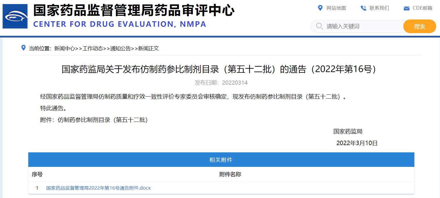 國(guó)家藥監(jiān)局關(guān)于發(fā)布仿制藥參比制劑目錄(第五十二批)的通告(2022年第16號(hào))