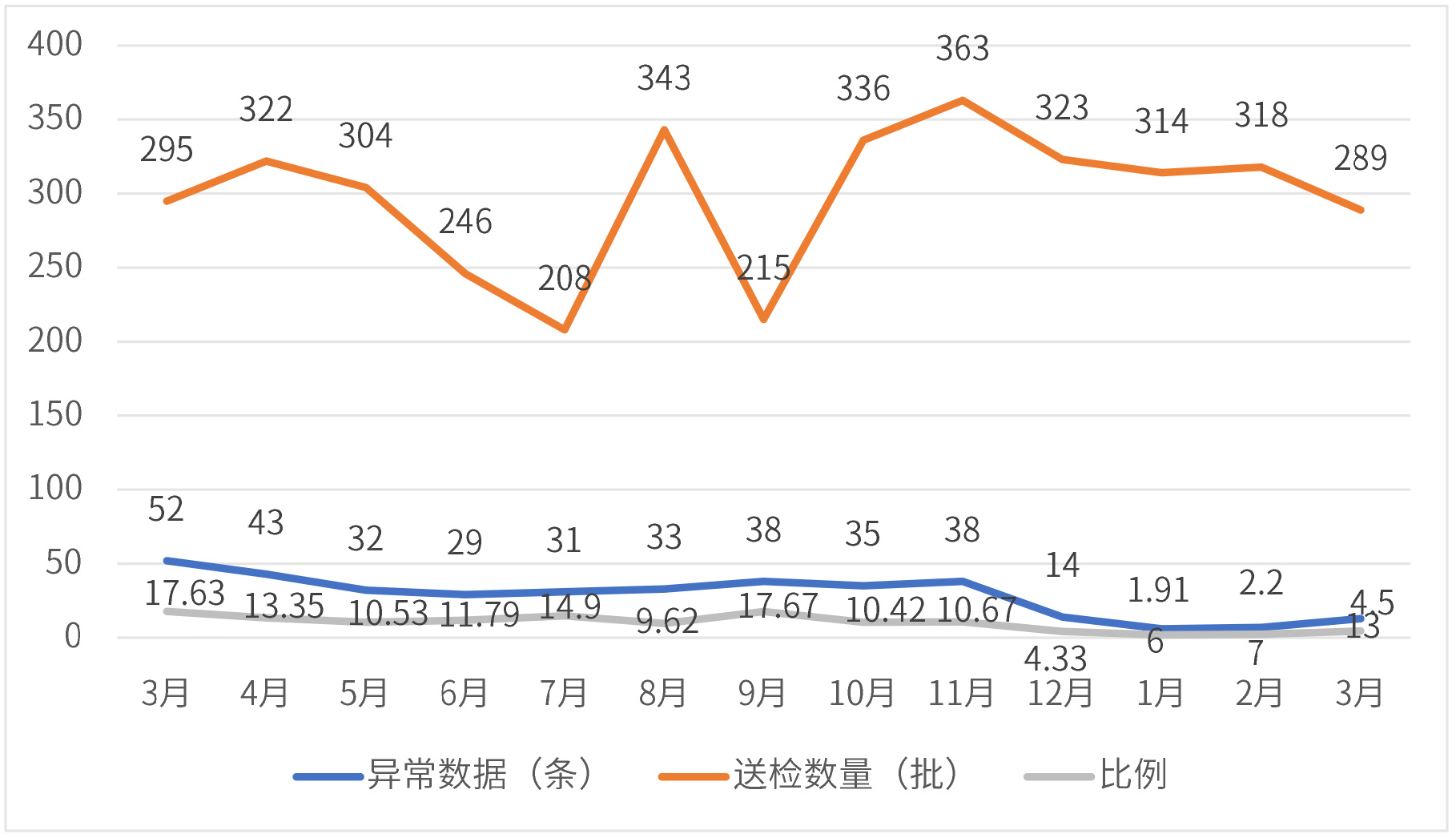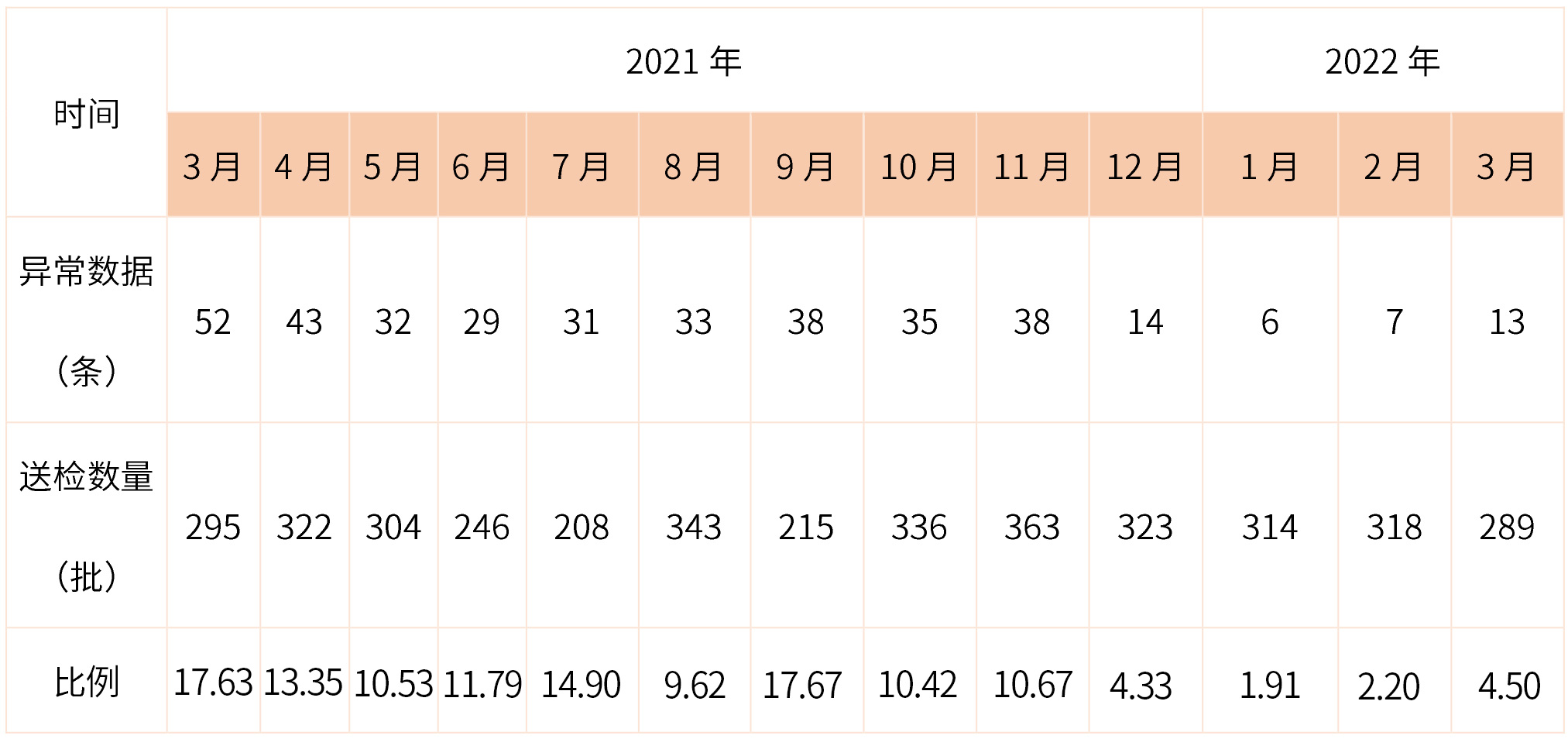 通過該工作方式,實(shí)驗(yàn)過程中數(shù)據(jù)的完整性、現(xiàn)場的合規(guī)性得到了很大的提高?,F(xiàn)以該公司2021年3月~2022年3月的異常數(shù)據(jù)指標(biāo)為例進(jìn)行效果分析。