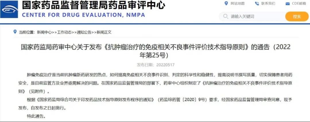 國家藥監(jiān)局藥審中心關(guān)于發(fā)布《抗腫瘤治療的免疫相關(guān)不良事件評價技術(shù)指導(dǎo)原則》的通告(2022年第25號)