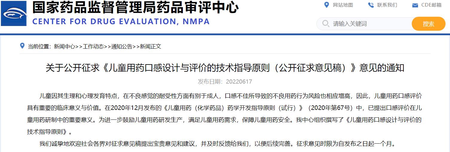國家藥監(jiān)局藥審中心關(guān)于公開征求《兒童用藥口感設(shè)計與評價的技術(shù)指導(dǎo)原則(公開征求意見稿)》意見的通知