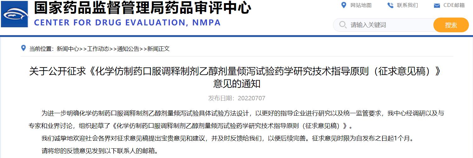 關(guān)于公開征求《化學(xué)仿制藥口服調(diào)釋制劑乙醇劑量傾瀉試驗(yàn)藥學(xué)研究技術(shù)指導(dǎo)原則(征求意見稿)》意見的通知