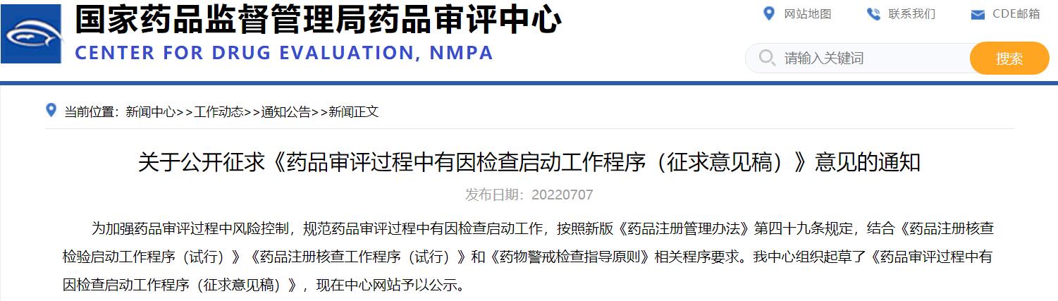 關(guān)于公開征求《藥品審評過程中有因檢查啟動(dòng)工作程序(征求意見稿)》意見的通知