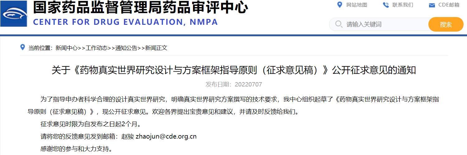 關(guān)于《藥物真實(shí)世界研究設(shè)計(jì)與方案框架指導(dǎo)原則(征求意見稿)》公開征求意見的通知