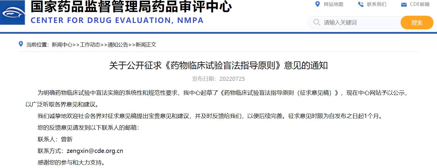 關(guān)于公開征求《藥物臨床試驗(yàn)盲法指導(dǎo)原則》意見的通知