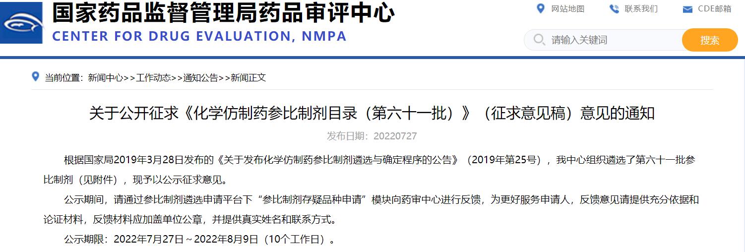關(guān)于公開征求《化學(xué)仿制藥參比制劑目錄(第六十一批)》(征求意見稿)意見的通知