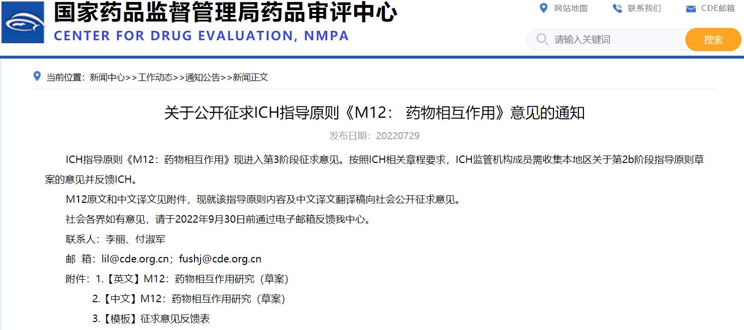 關(guān)于公開征求ICH指導(dǎo)原則《M12:藥物相互作用》意見的通知