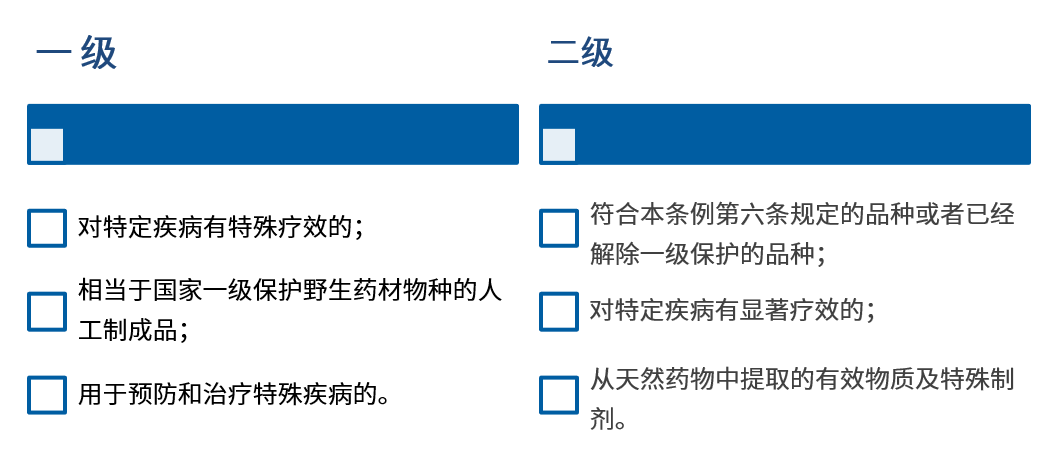 根據(jù)《中藥品種保護(hù)條例》,國家對受保護(hù)的中藥品種劃分一級和二級。中藥一級保護(hù)品種分別為三十年、二十年、十年;中藥二級保護(hù)品種為七年。