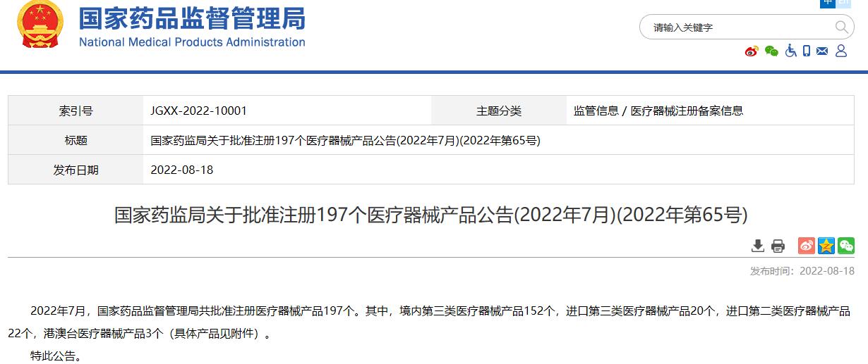國家藥監(jiān)局關(guān)于批準(zhǔn)注冊(cè)197個(gè)醫(yī)療器械產(chǎn)品公告(2022年7月)(2022年第65號(hào))