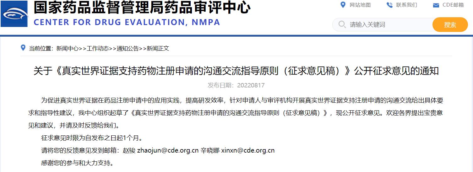 關(guān)于《真實(shí)世界證據(jù)支持藥物注冊(cè)申請(qǐng)的溝通交流指導(dǎo)原則(征求意見稿)》公開征求意見的通知