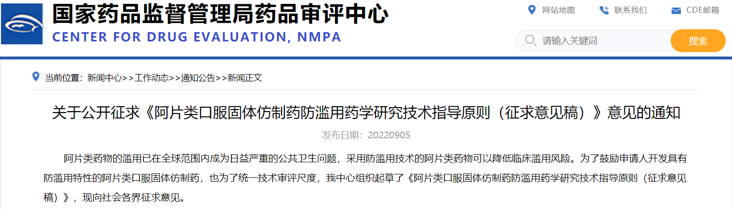 關(guān)于公開征求《阿片類口服固體仿制藥防濫用藥學(xué)研究技術(shù)指導(dǎo)原則(征求意見稿)》意見的通知