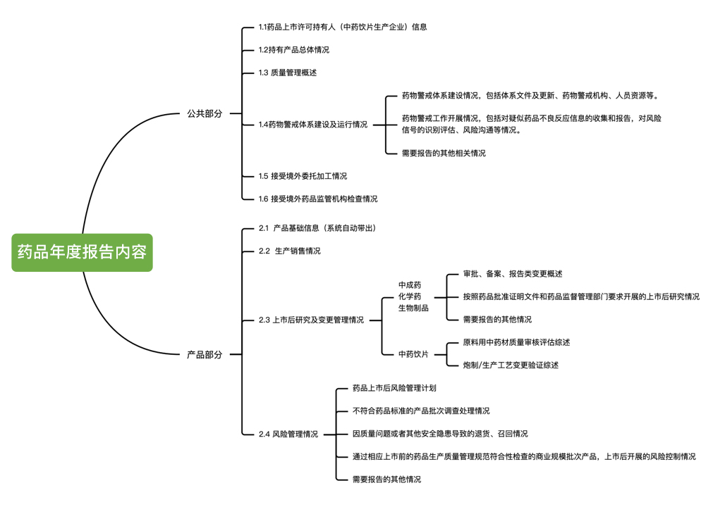 藥物警戒年度報告主要分為10部分,包括持有人信息、藥品信息、藥物警戒體系、各例藥品不良反應報告、定期分析評估、風險評估和控制、上市后安全性研究、藥物警戒工作自評、其他說明及附件列表。