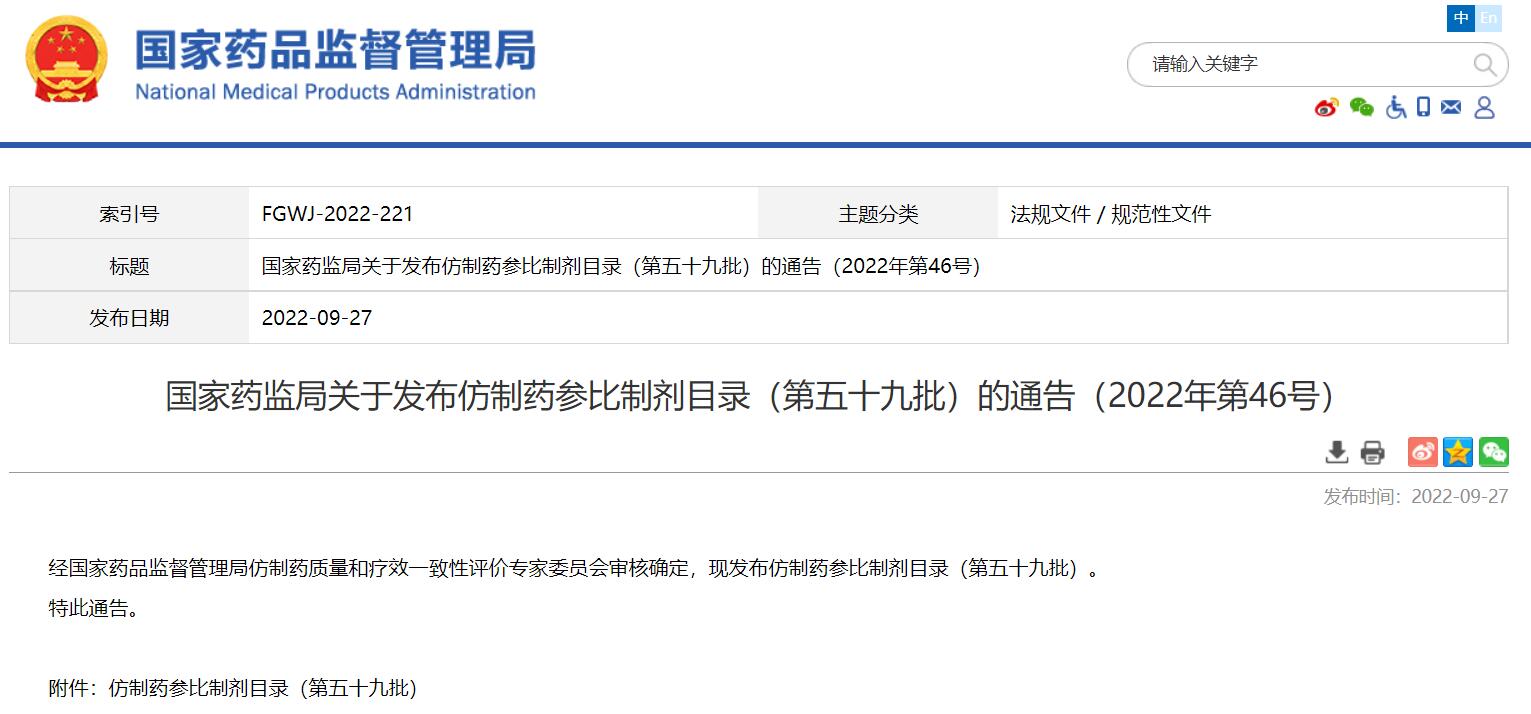 國家藥監(jiān)局關(guān)于發(fā)布仿制藥參比制劑目錄(第五十九批)的通告(2022年第46號)
