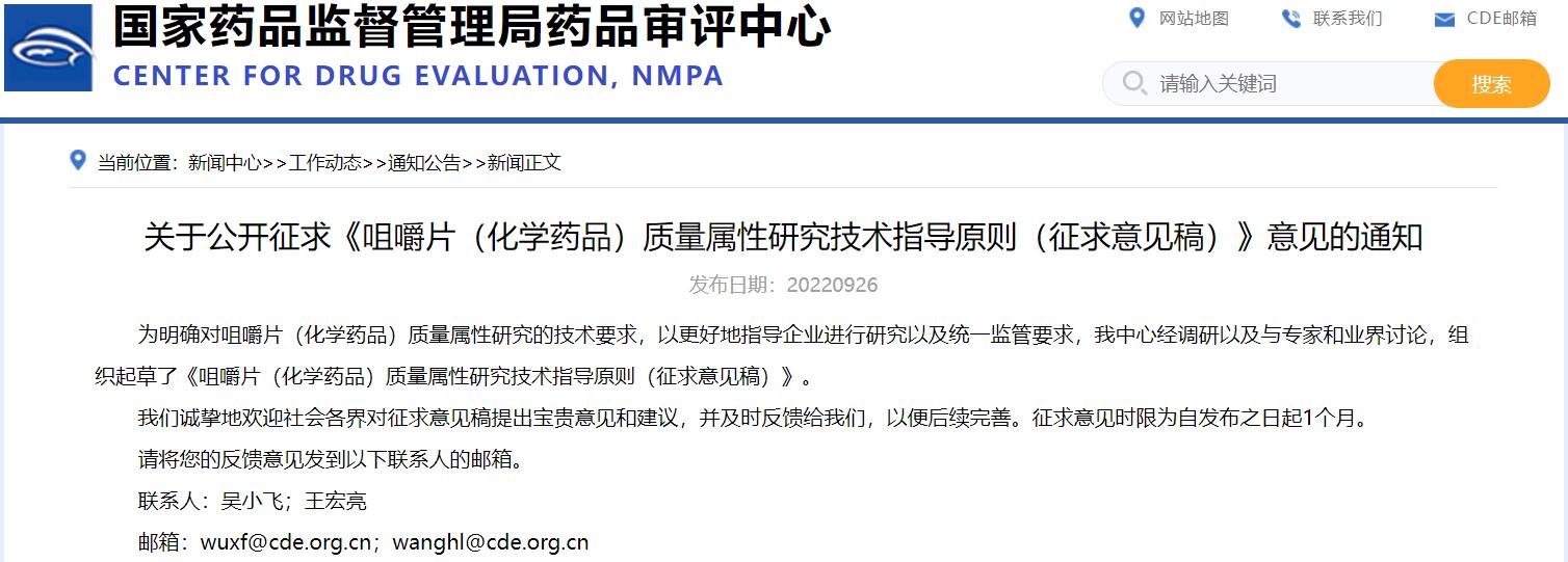 關(guān)于公開征求《咀嚼片(化學(xué)藥品)質(zhì)量屬性研究技術(shù)指導(dǎo)原則(征求意見稿)》意見的通知