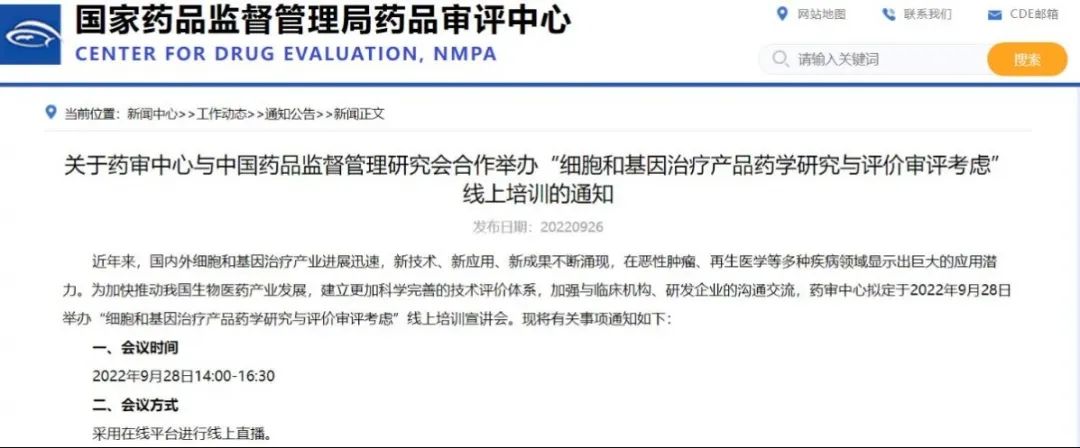 關(guān)于藥審中心與中國藥品監(jiān)督管理研究會合作舉辦“細(xì)胞和基因治療產(chǎn)品藥學(xué)研究與評價(jià)審評考慮”線上培訓(xùn)的通知