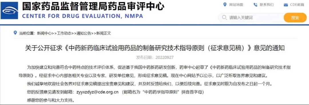 關(guān)于公開征求《基于人用經(jīng)驗(yàn)的中藥復(fù)方制劑新藥藥學(xué)研究技術(shù)指導(dǎo)原則(征求意見稿)》意見的通知