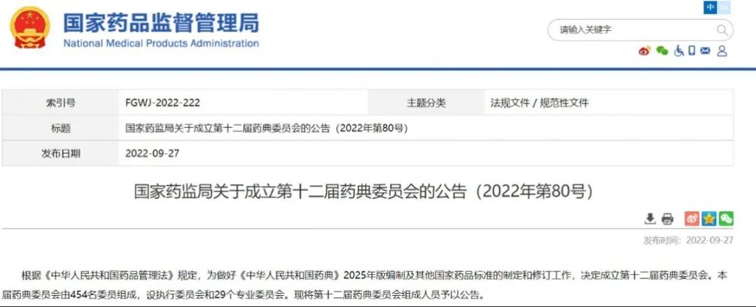 國家藥監(jiān)局關(guān)于成立第十二屆藥典委員會的公告(2022年第80號)