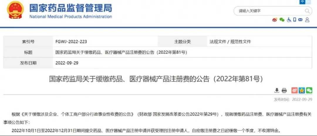 .國家藥監(jiān)局關(guān)于緩繳藥品、醫(yī)療器械產(chǎn)品注冊費(fèi)的公告(2022年第81號)
