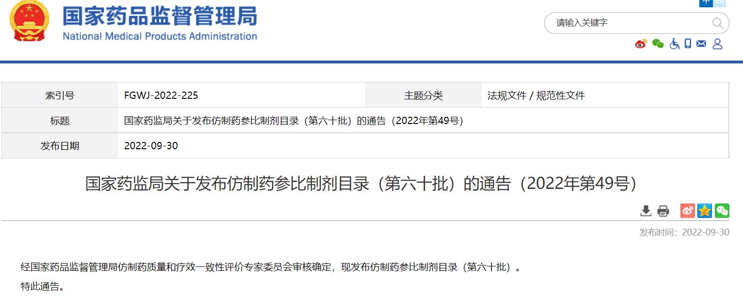 國家藥監(jiān)局關(guān)于發(fā)布仿制藥參比制劑目錄(第六十批)的通告(2022年第49號)