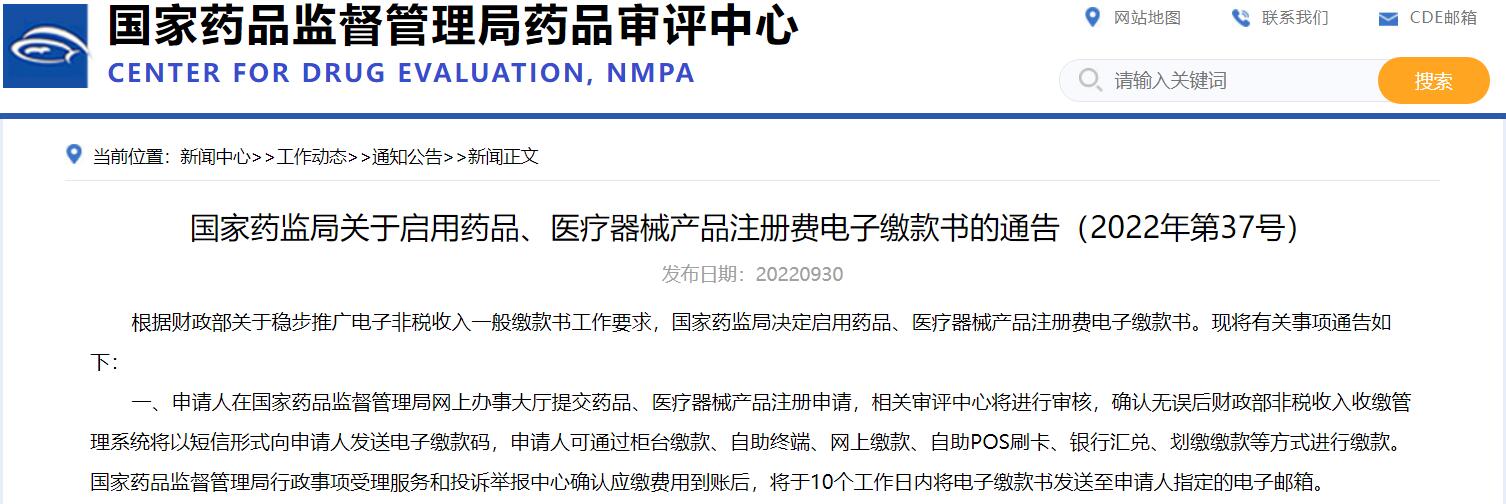 國家藥監(jiān)局關(guān)于啟用藥品、醫(yī)療器械產(chǎn)品注冊費(fèi)電子繳款書的通告(2022年第37號)