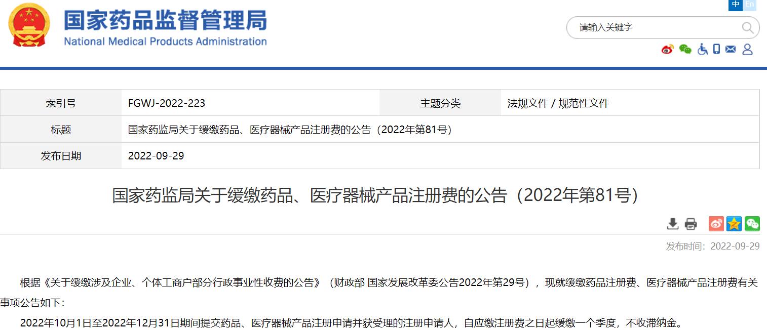 國家藥監(jiān)局關(guān)于緩繳藥品、醫(yī)療器械產(chǎn)品注冊費(fèi)的公告(2022年第81號)