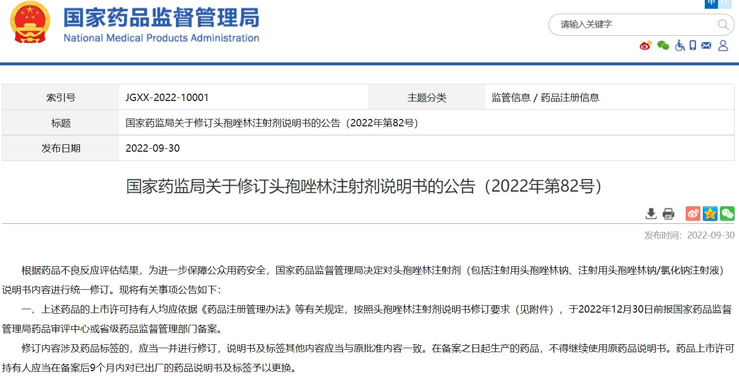 國家藥監(jiān)局關(guān)于修訂頭孢唑林注射劑說明書的公告(2022年第82號)
