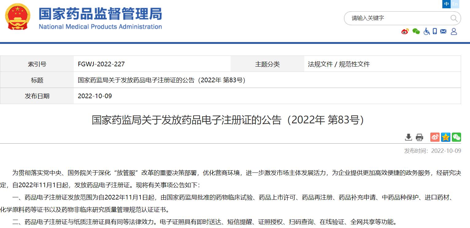 國家藥監(jiān)局關(guān)于發(fā)放藥品電子注冊證的公告(2022年 第83號)