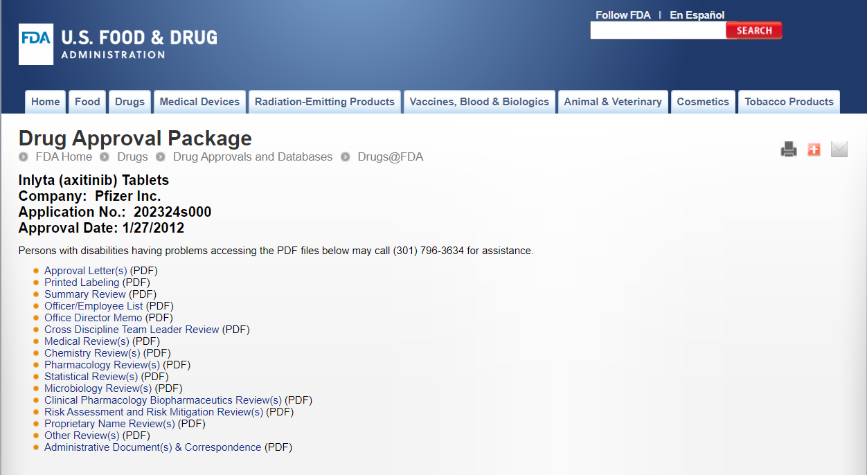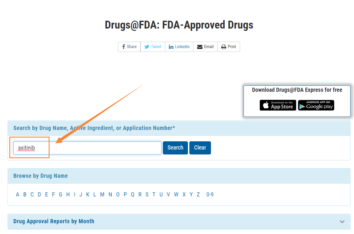 - 首先進(jìn)入Drugs@FDA的搜索欄輸入阿昔替尼片的活性成分“axitinib”,然后點(diǎn)擊提