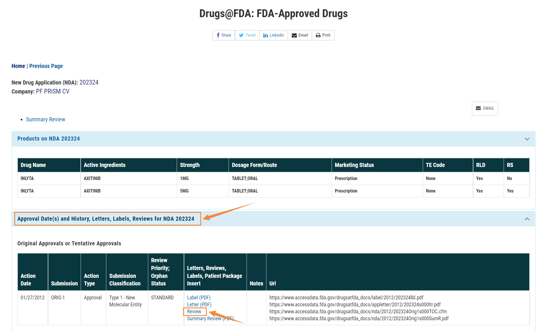 - 進(jìn)入”Drug Details”,看到藥品詳細(xì)信息,點(diǎn)擊”Approval Date(s) and History, Letters, Labels, Reviews for NDA 202324”,在菜單欄目選擇“Review”,即可看到相應(yīng)的審評(píng)報(bào)告