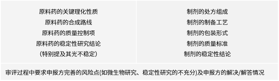 化學(xué)審查報(bào)告是對(duì)該藥物原料藥與制劑合成/生產(chǎn)工藝、理化性質(zhì)研究、質(zhì)量控制體系研究、穩(wěn)定性研究等方面的審查結(jié)論。在阿昔替尼片劑的化學(xué)審評(píng)報(bào)告(Chemistry Review)中,審評(píng)員總結(jié)概括的內(nèi)容涉及以下方面: