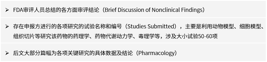 FDA審評(píng)報(bào)告中一般包含研究?jī)?nèi)容的報(bào)告如下:化學(xué)審查報(bào)告、藥理學(xué)審查報(bào)告、臨床藥理學(xué)/生物藥劑學(xué)審查報(bào)告、醫(yī)學(xué)審查報(bào)告等。