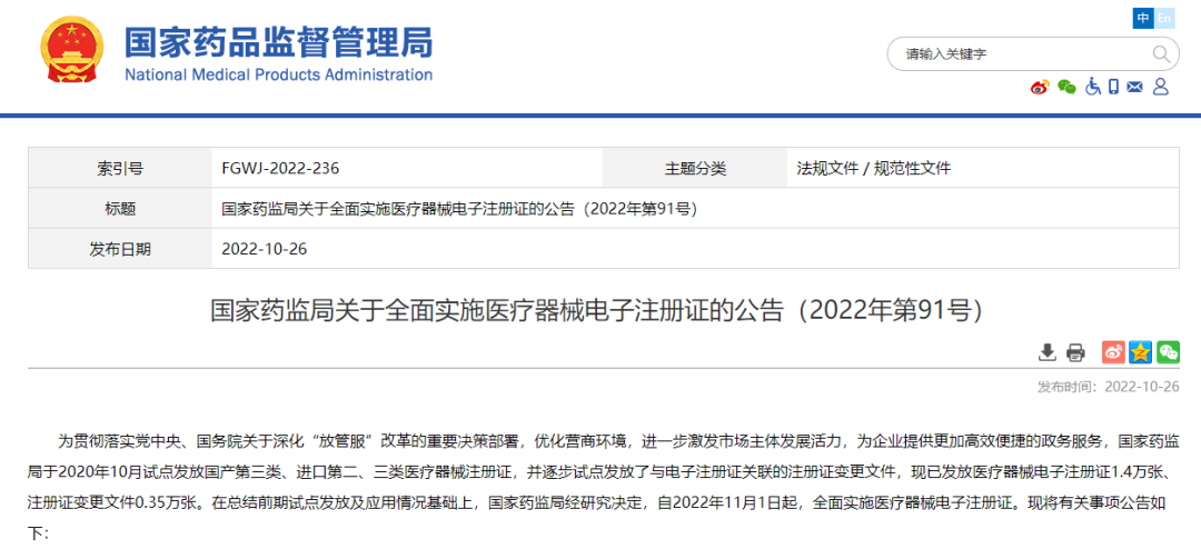 國家藥監(jiān)局關(guān)于全面實(shí)施醫(yī)療器械電子注冊證的公告(2022年第91號(hào))