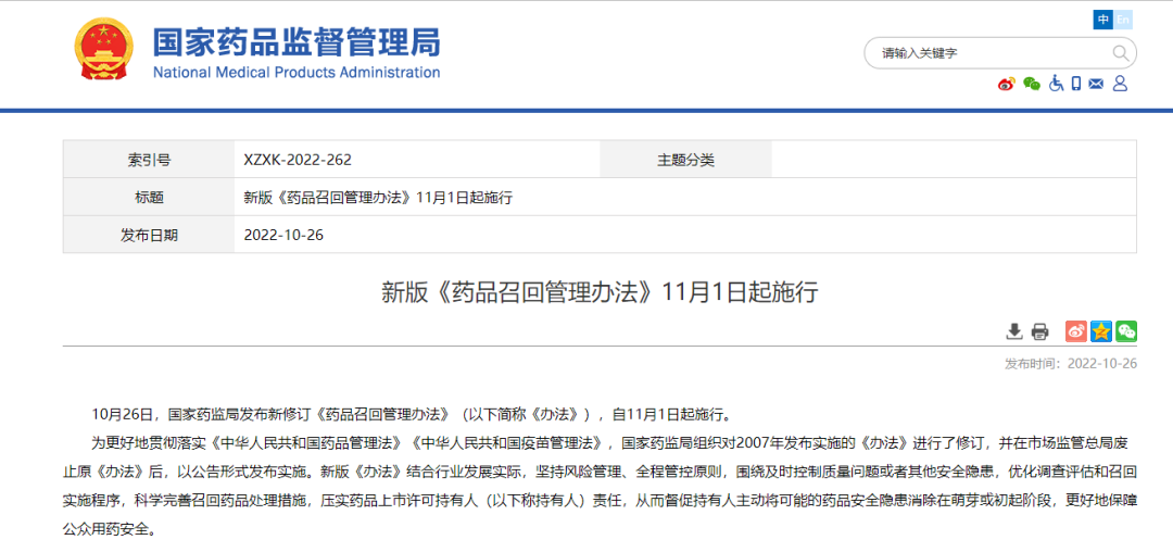 國家藥監(jiān)局關(guān)于發(fā)布《藥品召回管理辦法》的公告(2022年第92號(hào))
