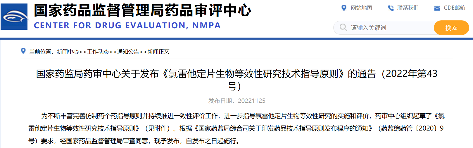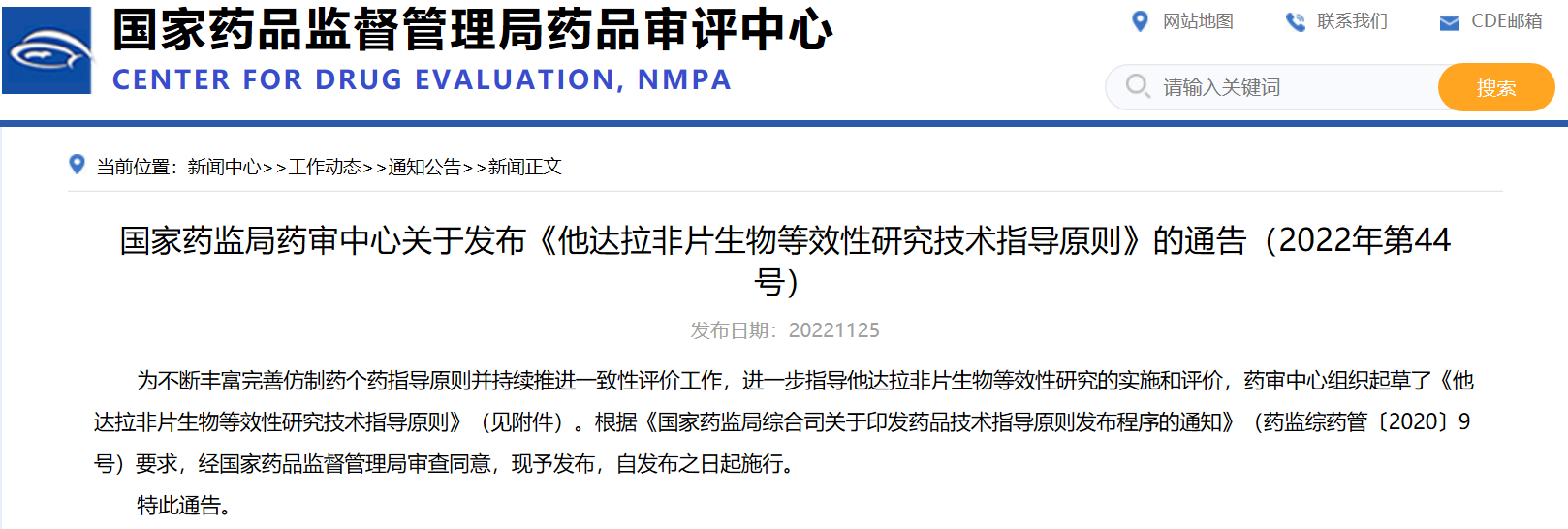 國(guó)家藥監(jiān)局藥審中心關(guān)于發(fā)布《他達(dá)拉非片生物等效性研究技術(shù)指導(dǎo)原則》的通告(2022年第44號(hào))