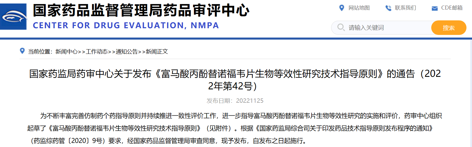 國(guó)家藥監(jiān)局藥審中心關(guān)于發(fā)布《富馬酸丙酚替諾福韋片生物等效性研究技術(shù)指導(dǎo)原則》的通告(2022年第42號(hào))