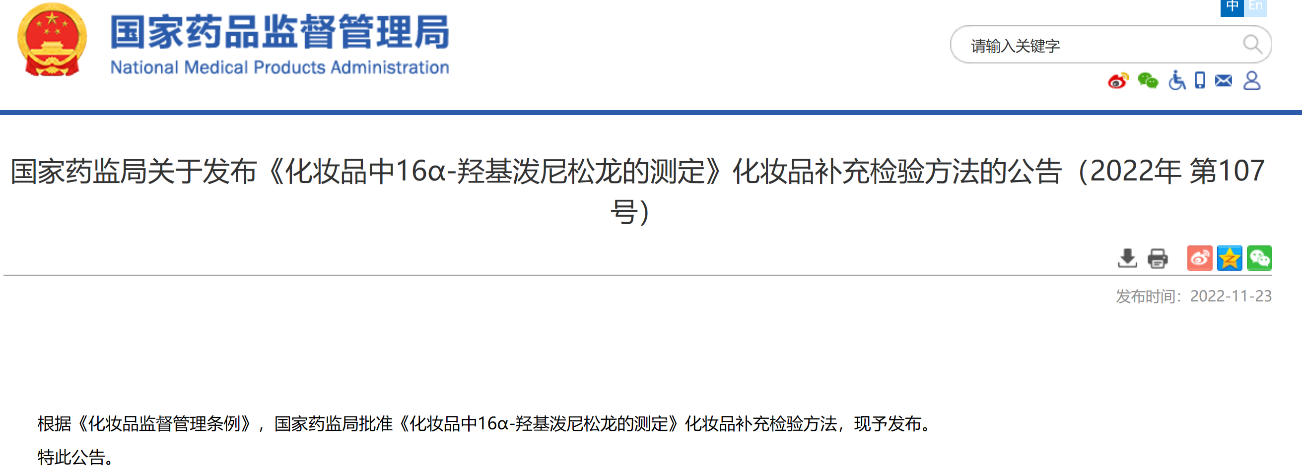 國(guó)家藥監(jiān)局關(guān)于發(fā)布《化妝品中16α-羥基潑尼松龍的測(cè)定》化妝品補(bǔ)充檢驗(yàn)方法的公告