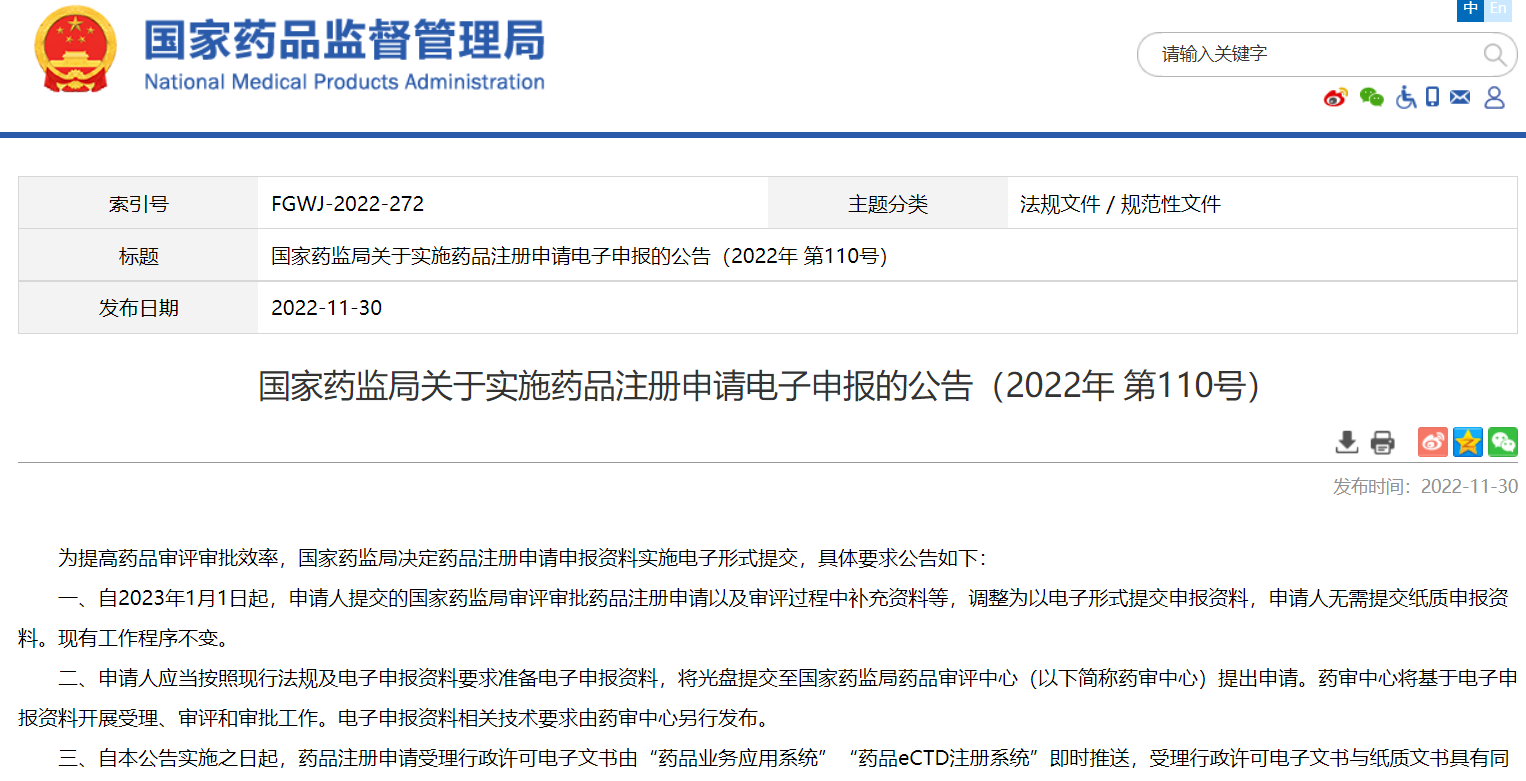 國(guó)家藥監(jiān)局關(guān)于實(shí)施藥品注冊(cè)申請(qǐng)電子申報(bào)的公告(2022年 第110號(hào))