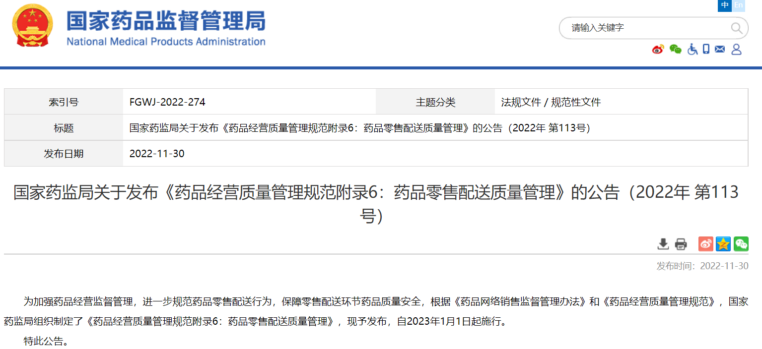 國(guó)家藥監(jiān)局關(guān)于發(fā)布《藥品經(jīng)營(yíng)質(zhì)量管理規(guī)范附錄6:藥品零售配送質(zhì)量管理》的公告(2022年 第113號(hào))