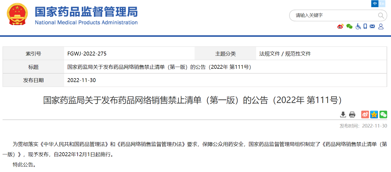 國(guó)家藥監(jiān)局關(guān)于發(fā)布藥品網(wǎng)絡(luò)銷售禁止清單(第一版)的公告(2022年 第111號(hào))