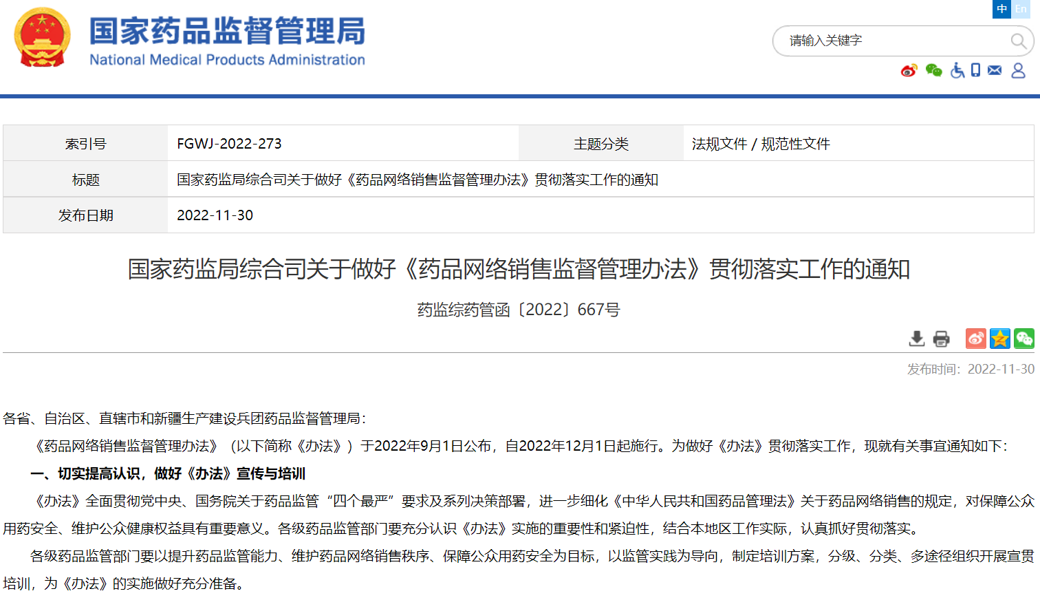 國(guó)家藥監(jiān)局關(guān)于規(guī)范藥品網(wǎng)絡(luò)銷售備案和報(bào)告工作的公告(2022年 第112號(hào))