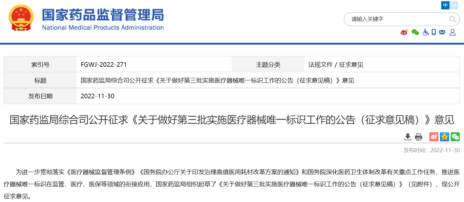 國(guó)家藥監(jiān)局綜合司公開征求《關(guān)于做好第三批實(shí)施醫(yī)療器械唯一標(biāo)識(shí)工作的公告(征求意見稿)》意見
